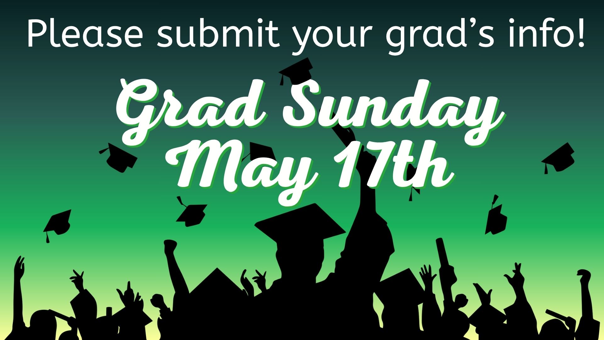We’re celebrating high school and higher education graduates on Sunday, 5/17! To do that well, we need your grad’s info by Monday, 5/11. Click below for info on how to do that!