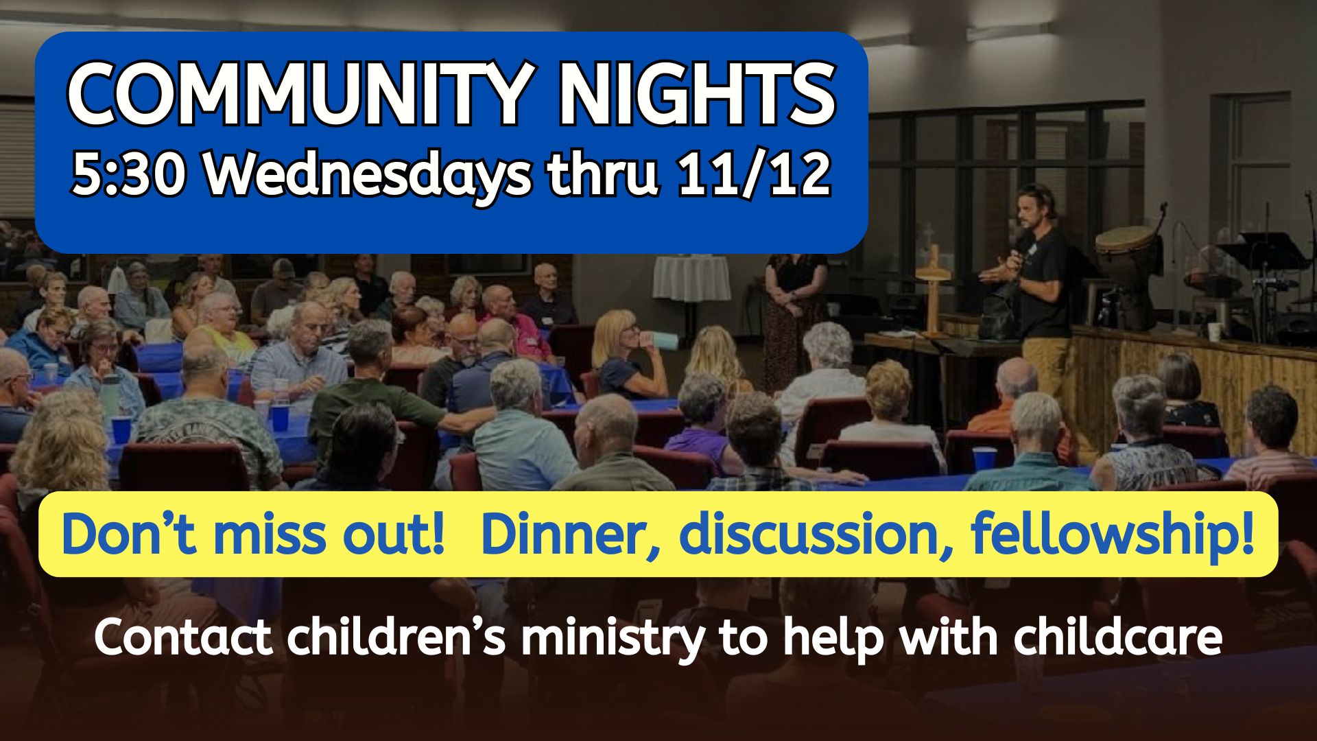 Join us for a weeknight opportunity for fellowship and spiritual growth. Our Wednesday evenings again pair with the prior Sunday sermons, helping us with application of what we’re learning.
