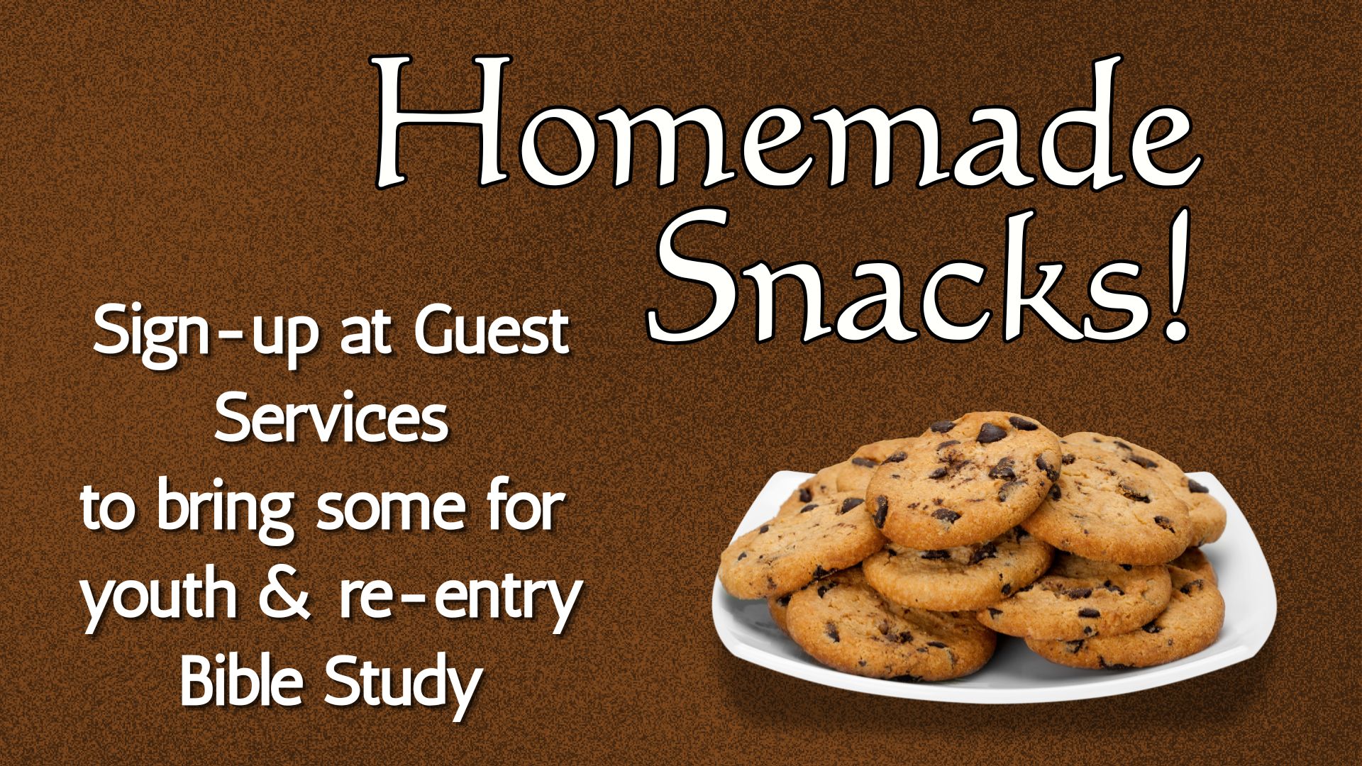 If you’d like to help to bless these two groups, this is an easy way to do it! Treats can be left at the Guest Services counter on Sundays. You can sign up there to bring treats for upcoming weeks. This is always a huge hit with both groups...bringing a little more love into their gatherings!