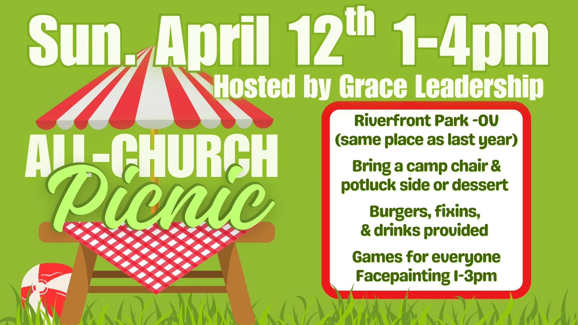 Come relax and have some fun with your church family Sunday, 4/12 at Riverfront Park!