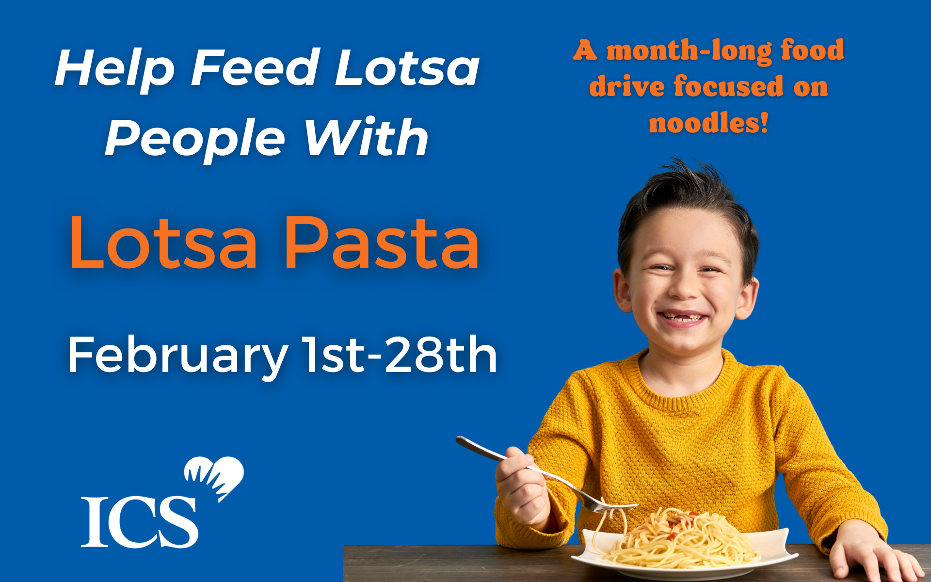 We’re partnering again with Interfaith Community Services (ICS) to help stock their pantry with pasta and sauce (no glass, please!). If you can help out, please bring your donations to church on Sundays all through the month of February and we’ll get it to ICS after the drive!