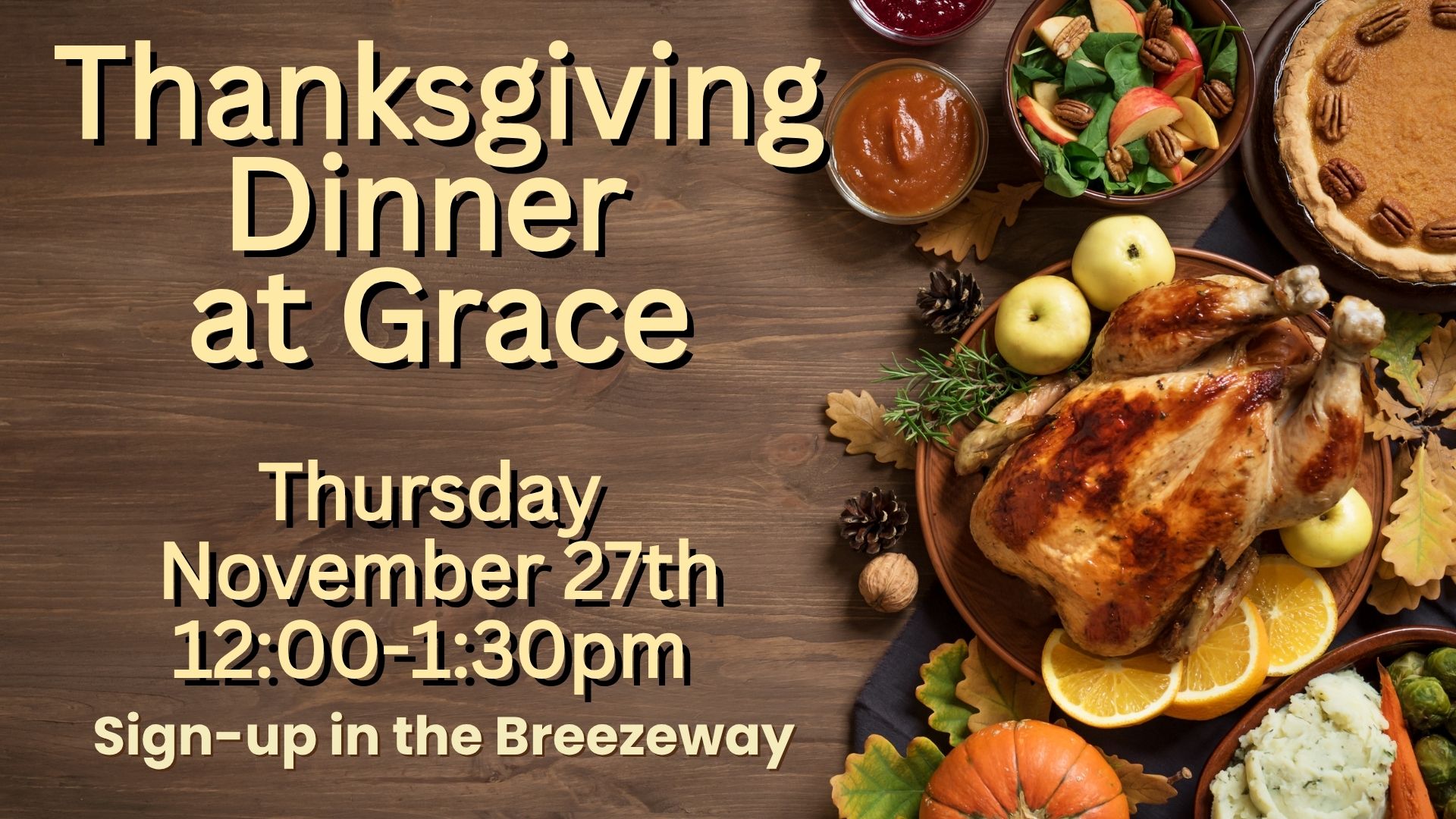 Don't spend Thanksgiving alone. Join us at Grace for dinner on November 27th at noon. Sign up in the breezeway today or contact Joe Crowson for info (email Joe at joseph231710@yahoo.com).